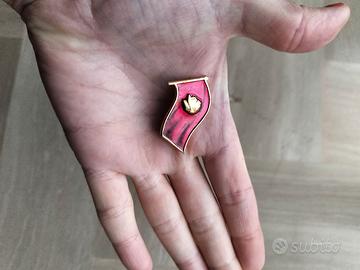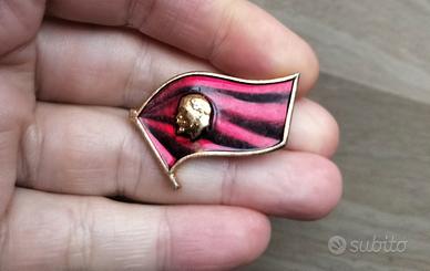 Spilla metallica vintage con volto di profilo di Vladimir Lenin di color oro su bandiera rossa sovietica (alta di rosso) .Chiusura a gancio sul retro color oro,dove è anche presente in timbro originale.Ottime condizioni.Possibile consegna anche a mano ad Arcore,Monza,Sesto e a Milano.