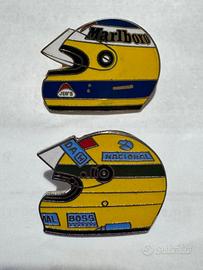 Due spille vintage caschi di Ayrton Senna e Michele Alboreto.