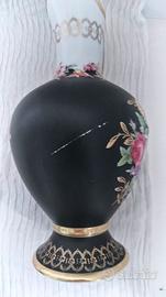 Questa brocca/vaso presenta una finitura in smalto nero intenso che contrasta splendidamente con vivaci motivi floreali dipinti a mano e generose applicazioni di oro sul manico, sulla base e sul bordo superiore.