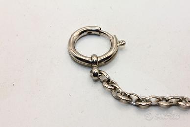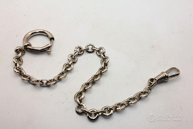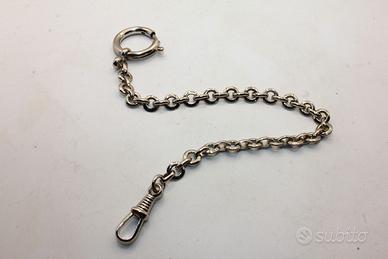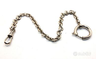Questa raffinata catena vintage per orologio da taschino si distingue per un design classico e una lavorazione di alta qualità. Realizzata in metallo con una luminosa finitura argentata, la catena presenta una maglia a grumetta piatta che assicura un’ottima flessibilità e una vestibilità confortevole. La struttura è dotata di un moschettone a molla su un'estremità e di un anello a vite sull'altra, garantendo praticità e sicurezza per il fissaggio dei propri segnatempo o ciondoli d'epoca. Con una lunghezza di 23,5 cm e un peso di 10,6 grammi, rappresenta un accessorio essenziale per il collezionista esigente, perfetto per donare un tocco di eleganza autentica e senza tempo a ogni orologio da taschino.