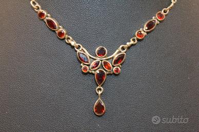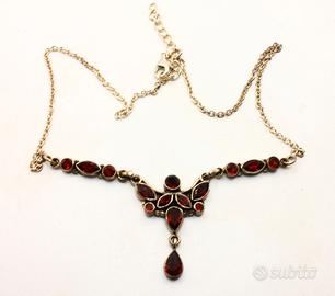 Questa splendida collana vintage in argento rappresenta un esempio di intramontabile raffinatezza, dove la lucentezza del metallo incontra il calore intenso di una selezione di granati autentici. Il gioiello si distingue per un design frontale articolato, caratterizzato da una geometria armoniosa che culmina in un pendente centrale a goccia, capace di donare luce e movimento a ogni gesto. La lavorazione dell'argento avvolge con precisione una serie di granati dai tagli variegati, alternando forme circolari e a marquise che si susseguono lungo la parte anteriore per enfatizzare la linea del decolleté. I granati, con la loro profonda tonalità rosso sangue, catturano la luce naturale restituendo riflessi magnetici e sofisticati. La struttura è completata da una maglia a catena sottile ma resistente, dotata di una chiusura regolabile che permette di adattare la lunghezza fino a 46 cm per una vestibilità sempre perfetta. Con un peso di 13,6 grammi, la collana offre una sensazione di piacevole consistenza senza rinunciare alla leggerezza, rendendola un accessorio ideale sia per le occasioni speciali che per impreziosire un outfit quotidiano con un tocco di eleganza d'altri tempi.