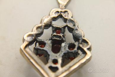 Splendida collana vintage in argento con pendente in marcasite e granati rossi, la catenina misura 43 cm e presenta una lavorazione a spina di pesce. Il pendente è finemente realizzato a rombo e impreziosito da pietre di granato rosso al centro, circondate da un'elegante decorazione in marcasite che conferisce un tocco di lucentezza e raffinatezza.
