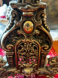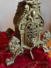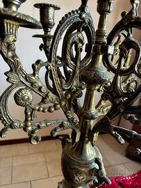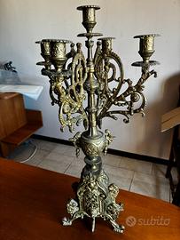 Splendida coppia di candelabri in bronzo dorato (periodo fine '800) a 5 fiamme. La base è sostenuta da 6 piedini (4 per ogni lato e 2 centrali) decorati. Ottimo stato di conservazione. Poiché il peso è importante, è disponibile il solo ritiro in zona Porto Viro (RO) con formula visto e piaciuto. Non esitate a contattarmi per eventuali domande.