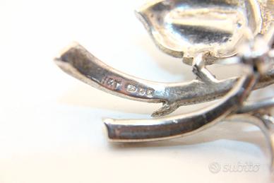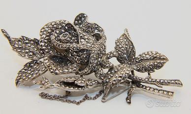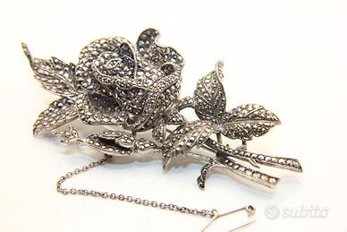 Imponente e affascinante, questa spilla a forma di rosa è un gioiello vintage di grandi dimensioni, 86 per 44 millimetri, e di un peso notevole, 36,5 grammi. Realizzata in argento e impreziosita da una ricca pavimentazione di marcasite, è un accessorio che non passa inosservato. Un vero e proprio gioiello da collezione.