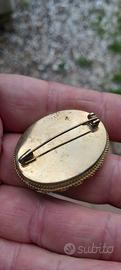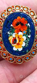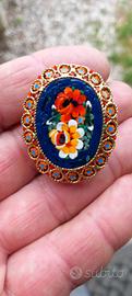 Splendida spilla vintage in autentico micromosaico italiano degli anni '50, caratterizzata da un minuzioso decoro floreale centrale con boccioli di rose rosse, margherite bianche e delicati fiori gialli e azzurri su un elegante fondo blu notte, il tutto racchiuso in una raffinata montatura ovale in ottone dorato con lavorazione a cordoncino e chiusura di sicurezza originale.