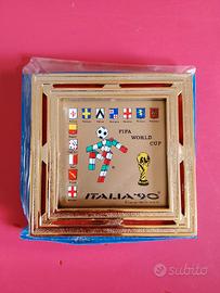splendida targa mondiali Italia 90, nuova mai usata cm. 10×10. con stemmi degli stadi ospitanti