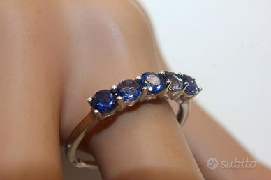 Un anello di luminosa eleganza, caratterizzato da un design classico e un colore vibrante. Questo splendido gioiello, con montatura in argento, presenta una sequenza lineare di cinque magnifiche pietre blu. Le gemme, dal taglio sfaccettato che ne esalta la brillantezza, catturano lo sguardo con le loro intense sfumature che danzano tra il blu e il viola a ogni movimento della mano. La loro disposizione a riviera crea un effetto di grande raffinatezza. Perfetto per aggiungere un tocco di colore e luce, questo anello dalla misura interna per il dito di 20 mm è un accessorio senza tempo, capace di coniugare semplicità e fascino.