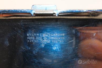 Questo splendido portasigarette vintage di manifattura inglese si distingue per l’intramontabile eleganza del design "Sylva Chrome". L'accessorio presenta una raffinata finitura esterna con una lavorazione geometrica finemente incisa che crea un piacevole gioco di riflessi sulla superficie cromata, arricchita da un piccolo cartiglio rettangolare liscio ideale per un'eventuale personalizzazione. Le generose dimensioni di 87 x 111 mm e il peso solido di 139,3 grammi conferiscono all'oggetto un’importante presenza materica e una grande piacevolezza al tatto. All'interno, la superficie specchiata rivela l'autenticità del pezzo attraverso i marchi di fabbrica chiaramente incisi che riportano il celebre logo "Emu Brand", la dicitura "Made in England" e il numero di brevetto 592790. La struttura è completata da una robusta cerniera centrale e da un sistema di chiusura a scatto perfettamente funzionale, testimoniando l'alta qualità artigianale britannica dell'epoca. Un pezzo da collezione che unisce utilità e fascino rétro, conservato in condizioni estetiche eccellenti.