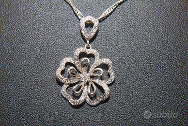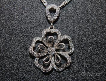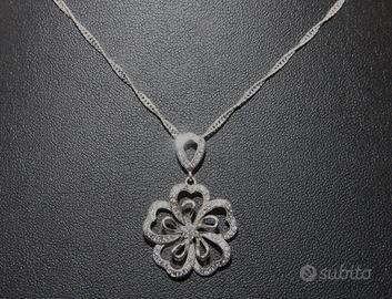 Splendido collier vintage in argento, adornato con pietre di zircone cubico (CZ). Il ciondolo a forma di fiore presenta una lavorazione aperta, con i petali e il centro impreziositi da piccole pietre scintillanti. La misura del ciondolo è 33 x 21 mm.