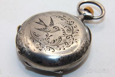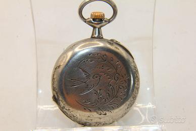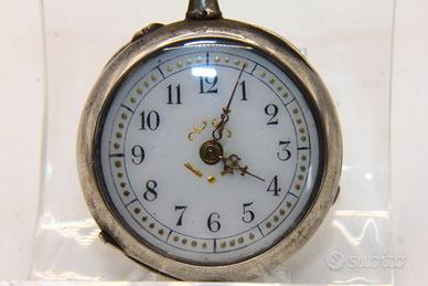 Questo splendido orologio da signora in argento della fine del 1800 rappresenta un gioiello di rara eleganza e testimonia la squisita manifattura dell'epoca vittoriana attraverso la sua cassa riccamente incisa con motivi floreali e ornamentali. Il quadrante bianco, finemente decorato al centro, ospita numeri romani classici e delicate lancette brunite che insieme conferiscono all'oggetto un fascino antico e intramontabile. Con una misura contenuta di 29 mm e un peso di 20,3 grammi, questo segnatempo vanta proporzioni graziose ed è arricchito da un anello di sospensione lavorato che ne permette l'utilizzo sia come orologio da taschino che come pendente da collana. Il movimento meccanico interno, accessibile tramite il doppio fondello punzonato per l'argento, conserva la sua integrità storica ma necessita di una revisione specialistica poiché il meccanismo tende a partire per poi fermarsi dopo poco. Ogni dettaglio, dalla texture del metallo prezioso alla complessità degli ingranaggi a vista, rende questo esemplare un pezzo da collezione di grande valore estetico, ideale per chi desidera restaurare un capolavoro di orologeria Liberty e restituirgli il suo antico splendore.
