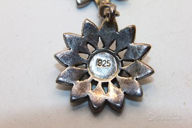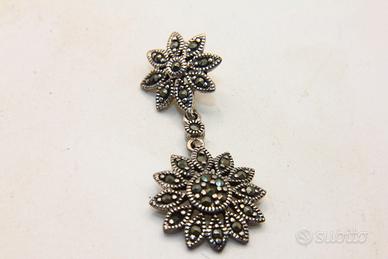 Questo raffinato gioiello vintage si distingue per l'intricata lavorazione artigianale e il fascino senza tempo dell'epoca déco. Il pendente è realizzato in argento sterling, come confermato dal punzone 925 visibile sul retro, e presenta una struttura articolata composta da due elementi floreali collegati da un piccolo anello di congiunzione che dona movimento al pezzo. Il design è interamente impreziosito da luminose marcasiti incastonate con precisione, che creano un delicato gioco di luci e riflessi metallici tipico di questo stile. La sezione superiore presenta una corolla stilizzata a sei petali, mentre la goccia inferiore, più grande e complessa, sfoggia un motivo a girasole o mandala con petali finemente traforati. Con le sue dimensioni di 35 x 16 mm, il pendente rappresenta un equilibrio perfetto tra eleganza classica e dettaglio ornamentale, rendendolo un accessorio distintivo per collezionisti e amanti del gioiello d'epoca.