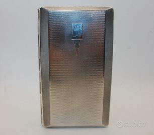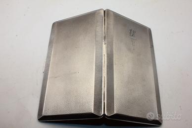 Questo splendido portasigarette degli anni '40 incarna perfettamente l'eleganza funzionale del periodo con una struttura cromata di altissima qualità che si presenta ancora oggi in condizioni eccellenti. La superficie esterna è impreziosita da una raffinata lavorazione guilloché a piccoli rombi che crea un sofisticato gioco di riflessi e luci mentre i bordi sono rifiniti con un motivo a righe orizzontali che ne accentua la silhouette geometrica. Un dettaglio di grande fascino è rappresentato dal cartiglio rettangolare posto nell'angolo superiore che ospita eleganti iniziali incise in corsivo sovrastando un decoro a cascata tipicamente Art Déco. Con le sue dimensioni generose di 84 x 147 millimetri e un peso solido di 178,2 grammi l'oggetto trasmette una sensazione di estrema robustezza e pregio al tatto. Aprendo il meccanismo a scatto si rivela un interno dorato lucente che contrasta magnificamente con l'esterno cromato conservando ancora l'elastico originale per fermare il contenuto. Si tratta di un pezzo da collezione impeccabile ideale per chi ricerca un accessorio d'epoca capace di unire il rigore dello stile d'anteguerra a una intramontabile raffinatezza estetica.