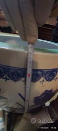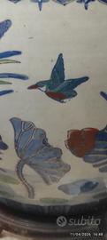 In vendita un magnifico vaso ornamentale in stile fatto a mano, caratterizzato da una ricca decorazione pittorica e una struttura imponente. Questo pezzo, perfetto come elemento d'arredo o porta-piante di lusso, viene venduto completo della sua base originale in legno. Caratteristiche Principali: Decorazione Artistica: Il corpo del vaso presenta una scena naturalistica vivida con fiori di loto (simbolo di purezza), ninfee e martin pescatori in volo. La palette cromatica spazia dal blu cobalto classico a tocchi di verde smeraldo e rosso ruggine.Dettagli di Pregio: Il bordo superiore è decorato con un raffinato motivo a greca verde all'interno e una fascia di cuori stilizzati sottosmalto all'esterno. Supporto Incluso: Elegante piedistallo in legno scuro intagliato con gambe curve e traforate, progettato specificamente per sostenere il peso del vaso e sollevarlo da terra con grazia. Condizioni: Ottime condizioni generali. La porcellana è integra, senza crepe evidenti. L'interno mostra leggeri segni naturali di utilizzo (perfetto per chi desidera un pezzo autentico).Misure (come da foto):ParteAltezzaDiametroVasocirca 43-45 cmcirca 50 cm (esterno)Vaso + Basecirca 65-70 cm-Nota tecnica: Il diametro della bocca interna è di circa 40 cm, rendendolo ideale anche per ospitare piante di grandi dimensioni. Ideale per: Arredamento di ingressi, saloni o giardini d'inverno. Collezionisti di porcellane orientali. Utilizzo come prestigioso porta-piante o vaso da carpe (fishbowl).