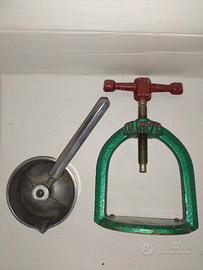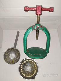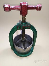 Antico spremi agrumi a torchio marca Olimpyc da collezione anni 50/60 è composto da tre pezzi:ciotolina,pressa e torchio realizzato in ferro e ghisa utensile che potrebbe servire sia come decorazione che x premere un limone arancia ecc.. alla vecchia maniera per gli amanti e i collezionisti di oggetti antichi. Funzionale al 100% si presenta in ottime condizioni come da foto. Per la consegna solo manualmente in zona con formula visto e piaciuto grazie.