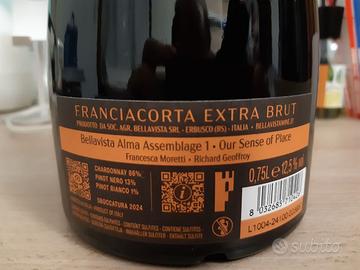Vendo interessante bottiglia di spumante extra brut. Marca Bellavista Franciacorta, Alma Assemblage 1. Sboccatura 2024, gradi 12,5% in volume, contenuto cl 75. Elegante confezione regalo originale inclusa. Vista la delicatezza dell'oggetto, la spedizione è possibile ma sotto la vostra esclusiva responsabilità.