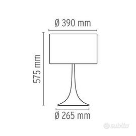 Lampada da tavolo a luce diffusa con corpo e diffusore in metallo tornito in lastra, bracci supporto diffusore e supporto portalampada in lega d’alluminio pressofuso, tutti verniciati a liquido nei colori sottindicati. I supporti diffusore sono in policarbonato bianco stampato ad iniezione. Schermo diffusore superiore in vetro pressato con finitura sabbiata. Sul cavo è presente il dimmer elettronico che consente la regolazione a step dell’intensità luminosa. Disponibile nei colori: Bianco lucido