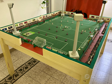 Stadio Subbuteo con tavolo in legno che diventa rapidamente e facilmente scrivania con porte professionali in metallo (+ porte varie tipologie e portieri per rinvio con le mani), 20 squadre, 8 gradinate e 350 spettatori dipinti a mano, 4 riflettori nella scatola originale (2 funzionanti e 2 da sistemare), tabellone completo in scatola originale, panchine complete con allenatori in varie posizioni, manager, riserve in varie posizioni, medici, 2 torrette tv (in conf. originale), 60 fotografi, cameraman, fonici, giornalisti varie epoche, 26 raccattapalle varie epoche anche in conf. originale, 26 raccattapalle varie epoche e varie posizioni, set bandierine e palloni in conf. originale varie epoche, staccionata montata e staccionata nuova in scatola originale, recinzione completa montata e recinzione aggiuntiva con barriere posti in piedi.