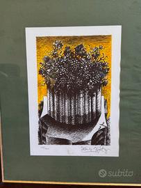 Vendo elegante stampa grafica originale, firmata a mano dall’artista e numerata 172/200. L’opera raffigura una composizione suggestiva e simbolica: da un busto classico scolpito emergono grappoli d’uva e foglie di vite, in un chiaro richiamo all’abbondanza, alla natura e alla tradizione.