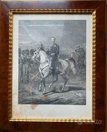 Affascinante e autentica stampa d'epoca (metà XIX secolo) raffigurante Re Carlo Alberto di Savoia a cavallo, in alta tenuta militare davanti alle truppe schierate dei Granatieri nei loro caratteristici berrettoni di pelo, dettaglio che colloca l'opera nel cuore dell'iconografia militare sabauda del 1848. Un pezzo di grande valore storico per collezionisti del Risorgimento e della dinastia sabauda. L'opera è impreziosita dal prestigioso timbro a secco originale dell'editore (TAV. I - NEGRO-TORINO) e riporta la firma del sovrano in facsimile alla base. Caratteristiche tecniche: • Editore: Litografia Negro, Torino (attiva nella metà dell'800 per ritratti ufficiali e militari). • Cornice: Elegante cornice d'epoca in legno pregiato (piuma di mogano/noce) con raffinato profilo interno dorato. • Misure totali: 35x42 cm (cornice inclusa). Condizioni: L'oggetto è originale dell'epoca (1840/50 circa). La carta presenta naturali segni del tempo e fioriture (macchie di umidità) che ne garantiscono l'autenticità storica. La cornice è strutturalmente solida e in ottime condizioni estetiche. Perfetta per arredare con classe studi professionali, librerie o case d'epoca. Spedizione: Disponibile per il ritiro a mano a zona Roma est.
