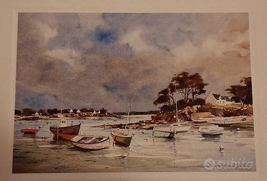 Splendida riproduzione artistica firmata dall'artista Morlaine, raffigurante un suggestivo paesaggio costiero dei dintorni di Dinard, in Bretagna (Francia). L'opera riproduce con estrema delicatezza la tecnica dell'acquerello, catturando l'atmosfera tipica dei porti bretoni con barche a vela e architetture locali. Editore: Lutèce Edition (Made in France). Soggetto: Marine, paesaggio costiero francese.