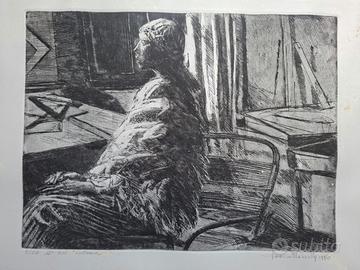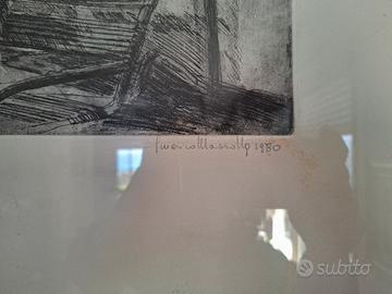 Stampa d'arte originale, di Americo Mazzotta, grandi dimensioni, prima edizione del 1983. Titolo: "interno" Tiratura: 5° copia di una tiratura estremamente limitatadi soli 20 esemplari. Disponibile spedizione privata. Misure: cornice 74,5x54 cm; immagine interna 39x29,5 cm.