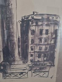 Stile: Tratto grafico dinamico ed espressivo, tipico del Novecento italiano. Lo stile richiama la "Scuola Romana" e le vedute di maestri come Filippo de Pisis, caratterizzato da un uso sapiente dei neri e dei contrasti.