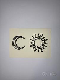 Stampa A6 sole e luna in tecnica lineografica a mano. Il colore del cartoncino è personalizzabile nei colori presentati. La cornice NON è in vendita, è a solo scopo decorativo. Contattatemi per ogni dubbio!!