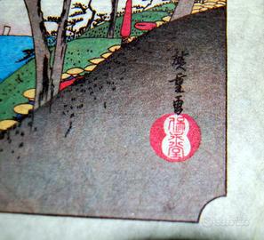 Vendo stampa riproduzione della serie TOKAIDO 53 dell'artista URAGAWA HIROSHIGE raffigurante la stazione 32 BAI XUHE' (SHIRASUKA). Rara su carta di riso molto spessa oppure carta di bamboo. Condizioni buone, purtroppo trovata piegata, per cui c'e' una lieve riga di piegatura al centro.
