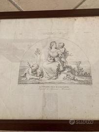 2 Stampe antiche rappresentanti 2 Baccanti e Fauni e La vergine , Gesu’ e San Guovanni , riproduzioni riguardanti pitture antiche di Pompei Stato di conservazione: Le stampe presentano evidenti fioriture, dovute a esposizione in ambiente umido, non per questo è compromessa la leggibilità del raffinato disegno neoclassico Disponibile ad inviare altre fotografie