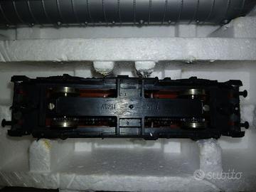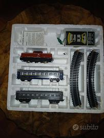 Start set H0 della Lima. Produzione vintage (metò anni '70) composto da locomotiva perfettamente funzionante e due vagoni passeggeri. Il set comprende un cerchio di binari ed un potenziometro a pile. La locomotiva - come da foto - è priva dei ganci e di un respingente.