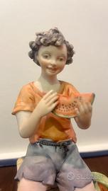 Statuetta policroma in perfette condizioni. Giovincello che mangia anguria seduto. Firmata Franco Altezza cm 16