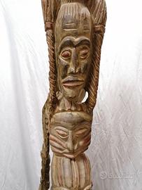 scultura in legno di arte tribale africana, probabilmente un palo o totem intagliato a mano con diverse figure e volti.