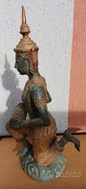 Statua del musicista tailandese Teppanom in bronzo dorato antico, Con una bella patina verderame e dettagli dorati. Il principe Pra Apai Manee suona un tradizionale strumento a tamburo asiatico. Autentica statua asiatica in bronzo, di produzione thailandese, risalente presumibilmente alla metà del XX secolo. Raffigura una divinità o un angelo custode thailandese, conosciuto come Teppanom, in abiti cerimoniali mentre suona un tradizionale tamburo Rammana. Caratterizzata da una ricca e distintiva patina verde che contrasta elegantemente con le aree dorate residue sui vestiti e sul copricapo appuntito. Dettagli scolpiti in modo raffinato e intricato, che catturano l'espressione serena e la postura elegante della figura inginocchiata. Un pezzo d'arte decorativa vintage ideale per collezionisti o per aggiungere un tocco esotico e spirituale all'arredamento di interni. Dimensioni e dettagli: