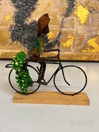 Questo pezzo unico, realizzato a mano con maestria, raffigura una figura vestita in abiti tradizionali in sella a una bicicletta, che trasporta un abbondante carico verde sul portapacchi posteriore.