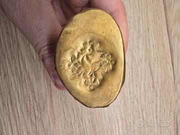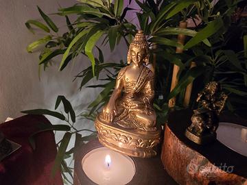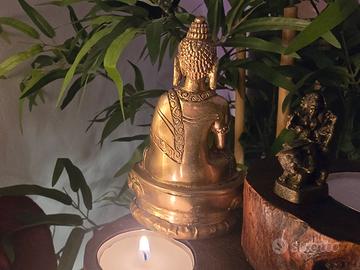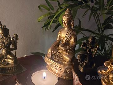 🧞♂️Al fine di venirvi incontro con il miglior prezzo possibile vi invito a dare un'occhiata anche agli altri articoli che ho attualmente in vendita. Splendida raffigurazione del Buddha della Medicina, un pezzo che unisce la profondità della simbologia spirituale alla qualità materica dell'ottone pieno. La scultura è realizzata nel classico stile tibetano-nepalese, riconoscibile per la raffinatezza dei lineamenti e per la ricchezza dei dettagli incisi sulla veste. La figura è rappresentata nella sua iconografia tradizionale: la mano sinistra accoglie il contenitore del nettare della guarigione, mentre la destra è distesa nel gesto della benevolenza e della cura. Si tratta di un oggetto di rara reperibilità in queste dimensioni, poiché presenta il fondello originale sigillato con il marchio di benedizione, a testimonianza della sua avvenuta consacrazione rituale. Questa caratteristica, unita allo stile autentico di area himalayana, lo rende un pezzo da collezione perfetto per un piccolo altare domestico o come compagno di viaggio spirituale, grazie alla sua portabilità e al peso solido di 274 grammi. Le condizioni sono eccellenti, con una patina dorata che esalta la serenità del volto e la lavorazione del trono a petali di loto. È un oggetto che fonde un ricercato stile design etnico con una storia di devozione e cura, ideale per chi cerca un elemento d'arredo dal significato profondo o un regalo unico e prezioso. Consegna a mano a Reggio Emilia o spedizione disponibile tramite il servizio di Subito.it.