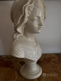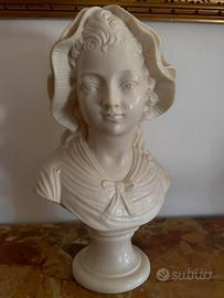 Statua busto di donna in polvere di marmo lucido, raffigurante immagine giovane donna, ben realizzata ed espressiva come sguardo. E' color avorio chiaro, alt. cm. 31 - largh. cm. 18 - prof. cm. 13. E’ una deliziosa statua d’epoca, acquistata negli anni ’70, elegante e raffinata ovunque venga esposta per bellezza. E' come nuova. Ritiro a Bologna o spedizione con Tutto Subito