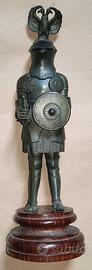 Scultura cavaliere medievale vintage in metallo patinato su base in legno, altezza circa 30 cm.