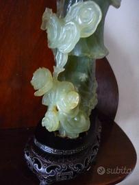 Statua cinese vintage in giada - figura femminile (Guanyin) +base in legno Descrizione: Scultura orientale d'epoca, risalente alla metà del XX secolo (periodo Repubblica/Vintage), finemente intagliata a mano in un unico blocco di pietra dura naturale (probabile Giada Serpentino / New Jade), con base in legno pregiato. L'opera raffigura una elegante figura femminile della tradizione cinese, identificabile come la divinità Guanyin o una fanciulla celestiale. La figura è rappresentata in una posa dinamica con vesti fluenti, nastri e attributi floreali, simbolo di grazia e benevolenza. Caratteristiche Principali: Materiale: Pietra dura naturale color verde celadon chiaro, con splendida traslucenza se colpita dalla luce. Dimensioni Totali: Altezza 27 cm (10,5 pollici), Larghezza 12 cm, Profondità 6,7 cm.Peso: Circa 800 grammi. Base: Include il suo supporto originale in legno scuro, finemente intagliato e traforato con motivi a greca e floreali. Condizioni:L'oggetto è in condizioni eccezionali, perfetto e integro. Non presenta sbeccature, rotture o restauri, né sui sottili petali dei fiori né sui bordi delle vesti (fatto rarissimo per sculture di questo materiale e d'epoca). Spedizione:Garantisco un imballaggio professionale