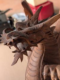 Splendida scultura di drago alato interamente realizzata e intagliata a mano in legno massiccio. L'opera si distingue per l'incredibile ricchezza di dettagli, visibile nelle scaglie del corpo, nella fisionomia del muso e nelle maestose ali spiegate. Un pezzo unico, perfetto come complemento d'arredo per appassionati di fantasy, collezionisti di draghi o per chi cerca un oggetto decorativo etnico di carattere. Materiale: Legno massiccio (probabilmente Suar/Mogano) Dimensioni: circa 35 x 30 cm Condizioni: Ottime, ben conservato