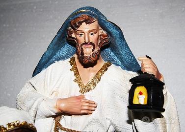 Bellissima riproduzione della natività in stile classico: Giuseppe in piedi tiene una lanterna nella mano sinistra, Gesù bambino nella mangiatoia, la Madonna in ginocchio tiene nelle mani un lenzuolino.