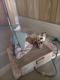 Uomo cestaio con bambino. Muove il braccio e la testa; da una cesta esce il bambino che si era nascosto. Testa dei personaggi in resina della Pigini.