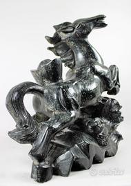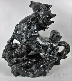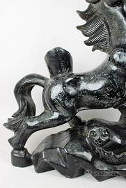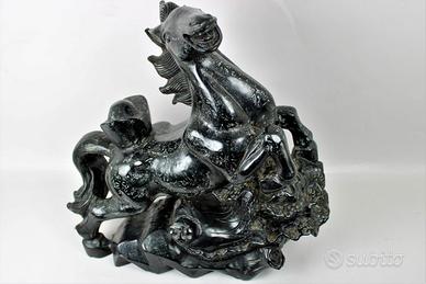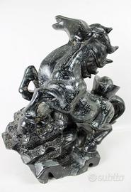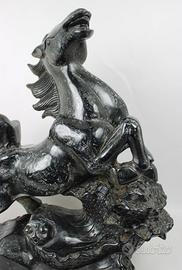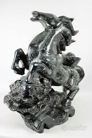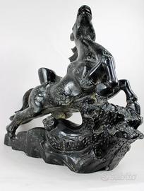 Pregevole scultura in pietra raffigurante un cavallo rampante con copricapo Mongolo sulla groppa.