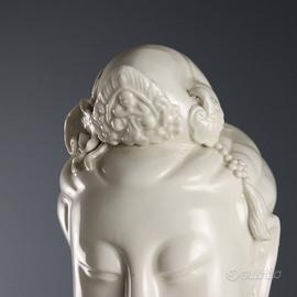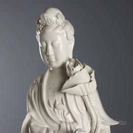 Scultura in blanc de chine raffigurante Guanyin con fiore di loto. La figura