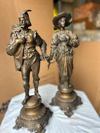 Coppia di Statue In Metallo Raffiguranti una Donna ben vestita con cappello e un Uomo in veste Cordiale in bronzo.