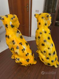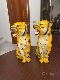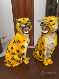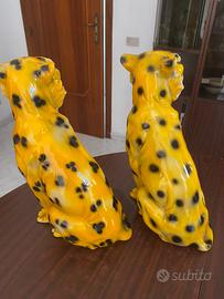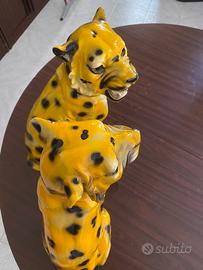 Statue di leopardi vintage in ceramica altezza cm 39 risalenti agli anni 60 e spesso associate allo stile Hollywood Regency. Realizzate in ceramica smaltate a mano con colori vivaci , giallo intenso con macchie nete. Oggetto vintage da collezione. Vendo la coppia a € 100 possibile vendita anche singolarmente..
