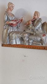 Applique in gesso, rappresenta una scena galante in stile settecentesco con una musicista e un suonatore di flauto. Materiale: Gesso decorato. Soggetto: Coppia settecentesca seduta a un tavolo. Utilizzo: Decorazione da parete. Stile: Classico/Vintage.