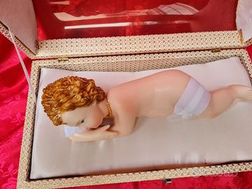 Statuetta di Gesù Bambino in cera con meccanismo di movimento collegato a carillon con musica natalizia (Tu scendi dalle stelle).