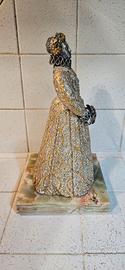 La regina Elisabetta I figura nella menta di Birmingham Anna Danesin Ltd ed. Questa scultura in bronzo finemente fusa presenta una rappresentazione dignitosa della regina Elisabetta I, uno dei monarchi più influenti e duraturi della Gran Bretagna. Eseguita con eccezionale attenzione ai dettagli del costume, alla struttura superficiale e alle proporzioni, la figura riflette la grandezza e la presenza cerimoniale associate alla corte elisabettiana. Prodotto dalla scultrice Anna Danesin, la figura della Regina è montata su una base in onice lucidata, fornendo sia contrasto visivo che notevole stabilità.