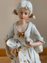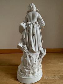 Statuetta femminile in porcellana bianca con decoro in oro zecchino. Marchio corona con sotto una ‘P’. Altezza cm 31