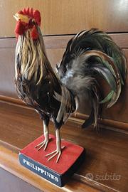 Souvenir artigianale delle Philippines, anni ‘80, raffigurante un elegante gallo, dal portamento vigile, simbolo di coraggio, orgoglio e combattività, realizzato con piume vere e con lunghe penne della coda (tipico della razza ornamentale Phoenix Onagadori)